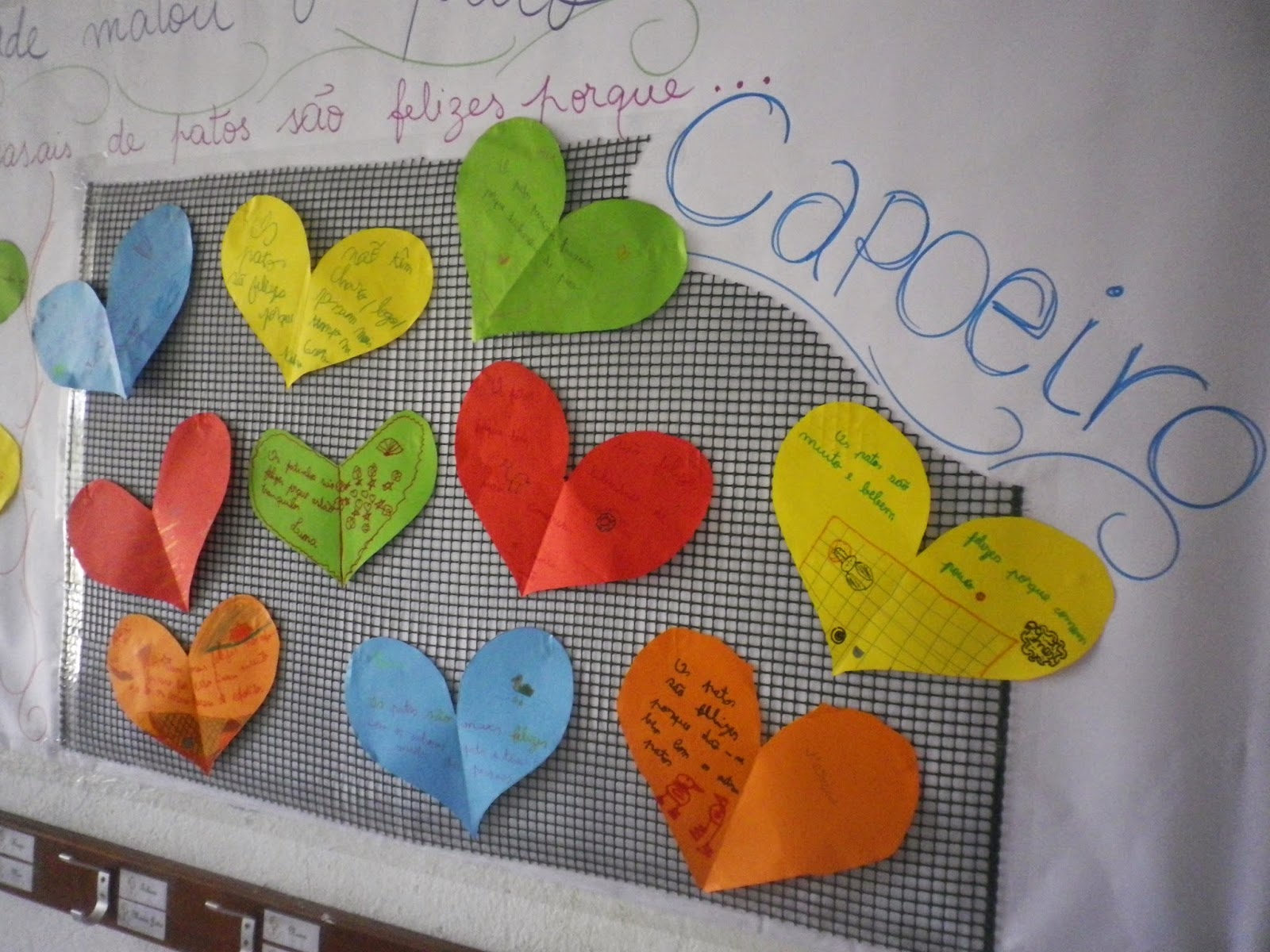 Nas aulas de Artes Plásticas, os alunos aproveitaram para dar asas à criatividade e representar as conclusões do projeto para toda a Comunidade Educativa. Como concluíram que os patos são felizes quer no charco, quer no capoeiro, apesar de apresentarem indicadores de felicidade diferentes, os alunos expressaram em corações coloridos, as razões que os levaram a esta conclusão.
